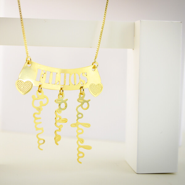 Colar Canga Filhos, com Nomes Pendurados, Banhado a Ouro
