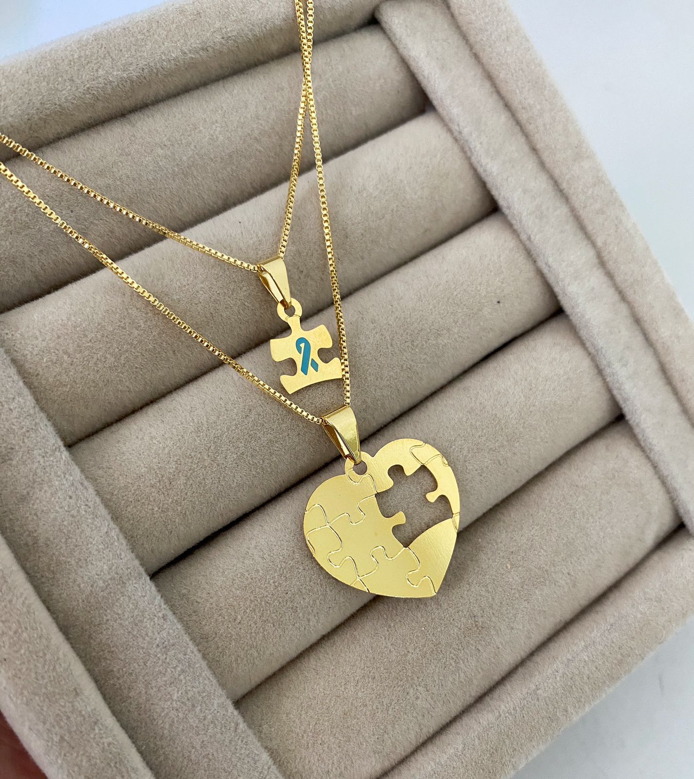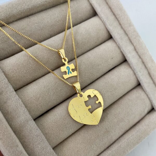 Colar Autismo Duplo, Coração + Quebra-cabeça Menino, Banhado