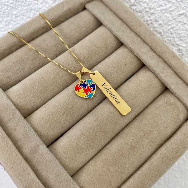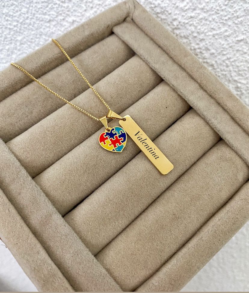 Colar Autismo, Coração + Plaquinha Personalizado com Nome, Banhado