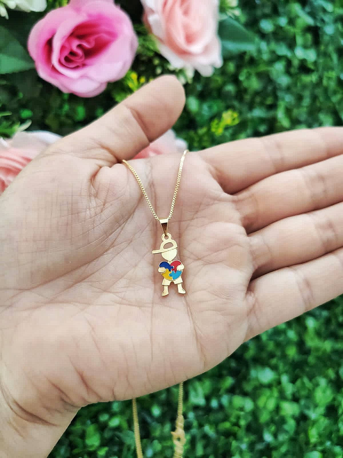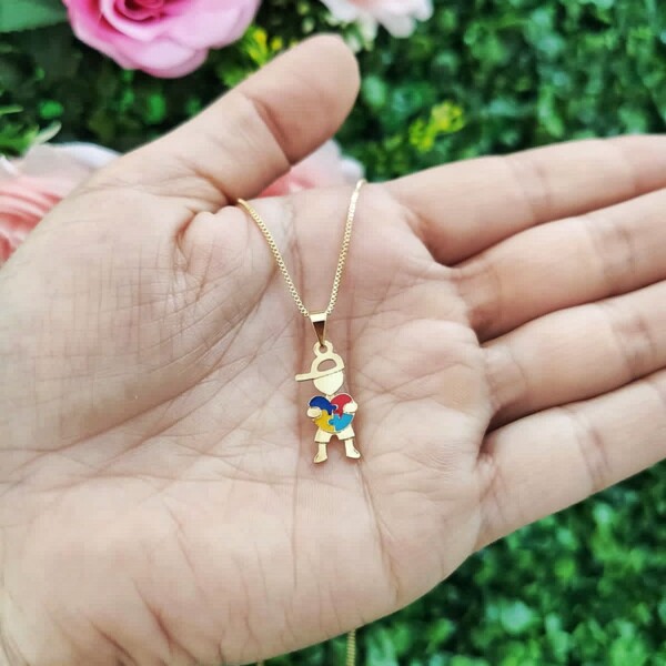 Colar Autismo TEA, Menino com Coração, Banhado a Ouro