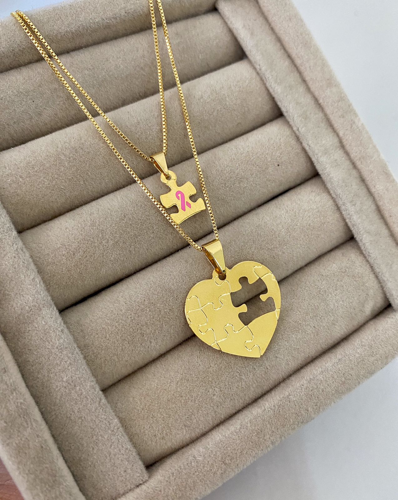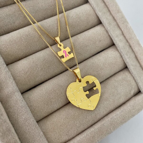 Colar Autismo Duplo, Coração + Quebra-cabeça Menina, Banhado