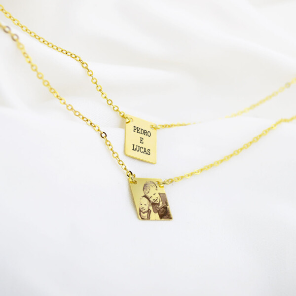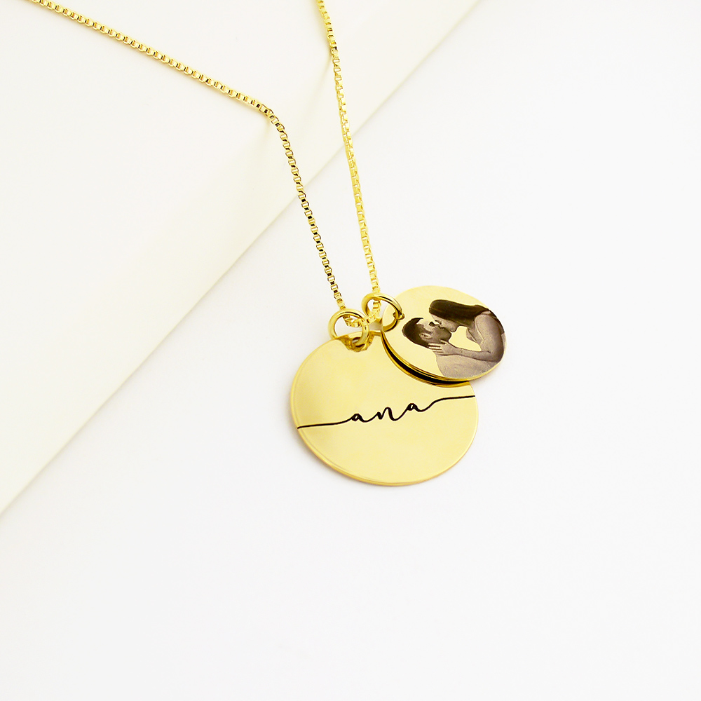 Colar Redondo Duplo, Personalizado com Nome e Foto, Banhado a ouro