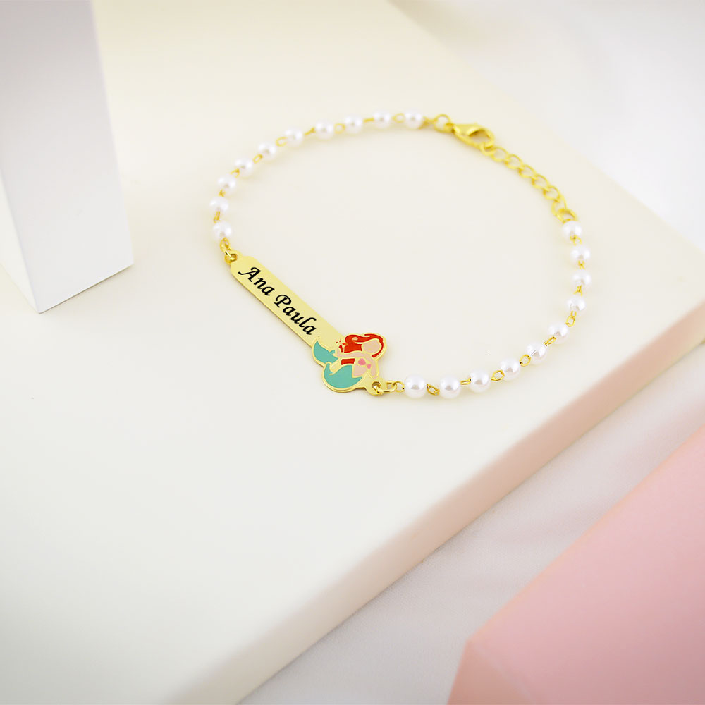 Pulseira Infantil de Pérola, Sereia com Resina, Banhado