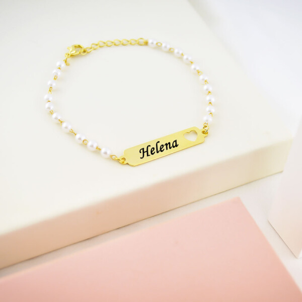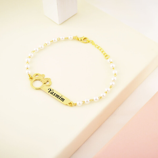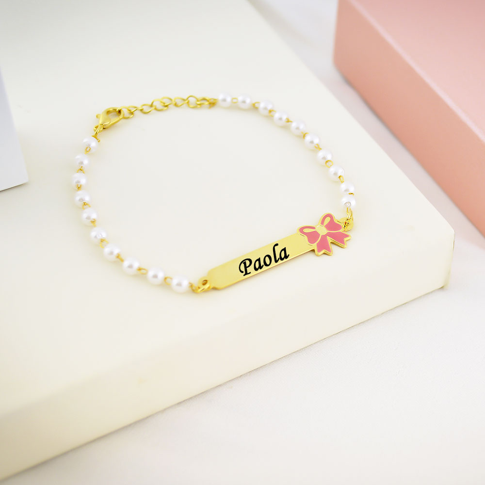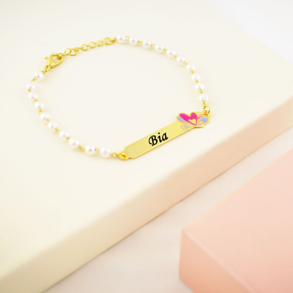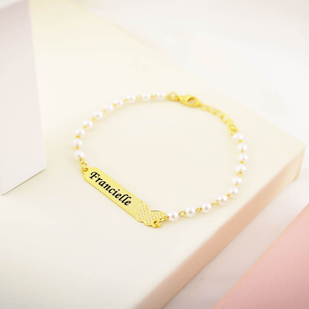 Pulseira Infantil de Pérola, Borboleta com Nome, Banhado