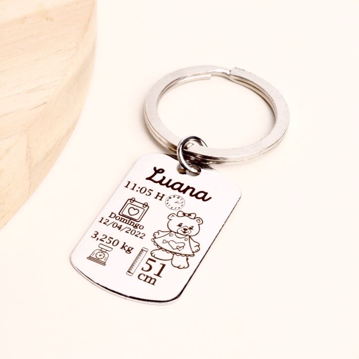 Chaveiro de Inox Placa, Gravado Dados de Nascimento do Bebê
